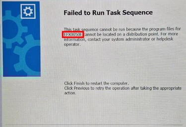 The task sequence cannot be run because the program files for ABC00xxx cannot be located on a distribution point. For more information, contact your system administrator or helpdesk operator.