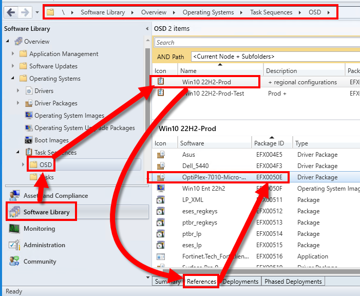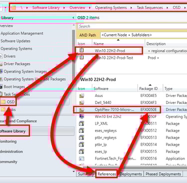 Lets find the package associated with this item referenced in the task sequence. To find the reference item in MECM/SCCM console go to Software LibraryOverviewOperating SystemsTask SequencesOSD