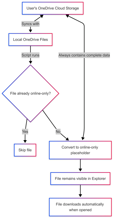 The OneDrive space management solution automatically converts already-synced files on company devices to online-only status, denoted by cloud icons. This means that while the files remain accessible and visible to users, they are no longer taking up valuable local storage space. When a user clicks on these files, they download automatically from the Microsoft cloud storage, allowing easy access without compromising employee productivity.