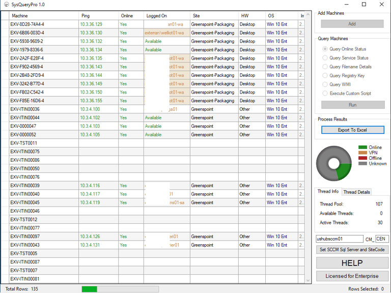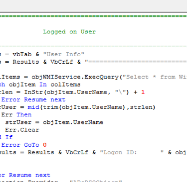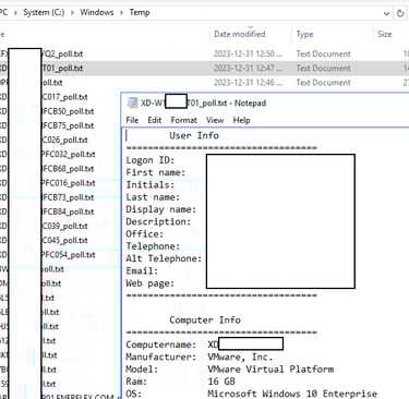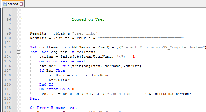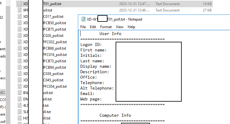 Click execute Script and select the poll.vbs file. This will run against all these computers and save to the location you select. Here is an example output. Personal information is covered.