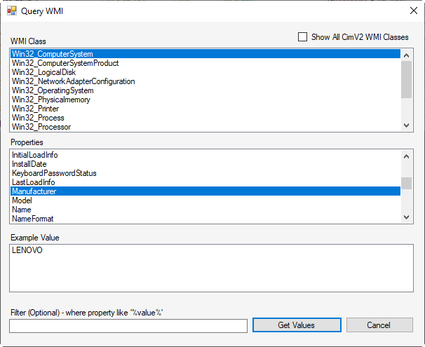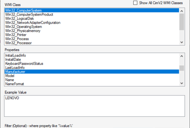 Once you select the Class name, you can select a property that you wish to Query. In this example i am looking for the "Win32_Computersystem" Class and the "Manufacturer" property. It shows the local systems results being a Lenovo computer.